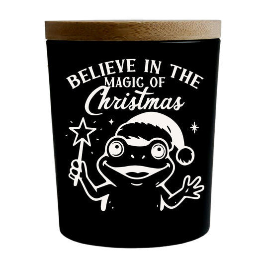 Believe in the Magic of Christmas | Frog Lovers Engraved Soy Candle | Flannel Type Scented + Crackling Wood Wick