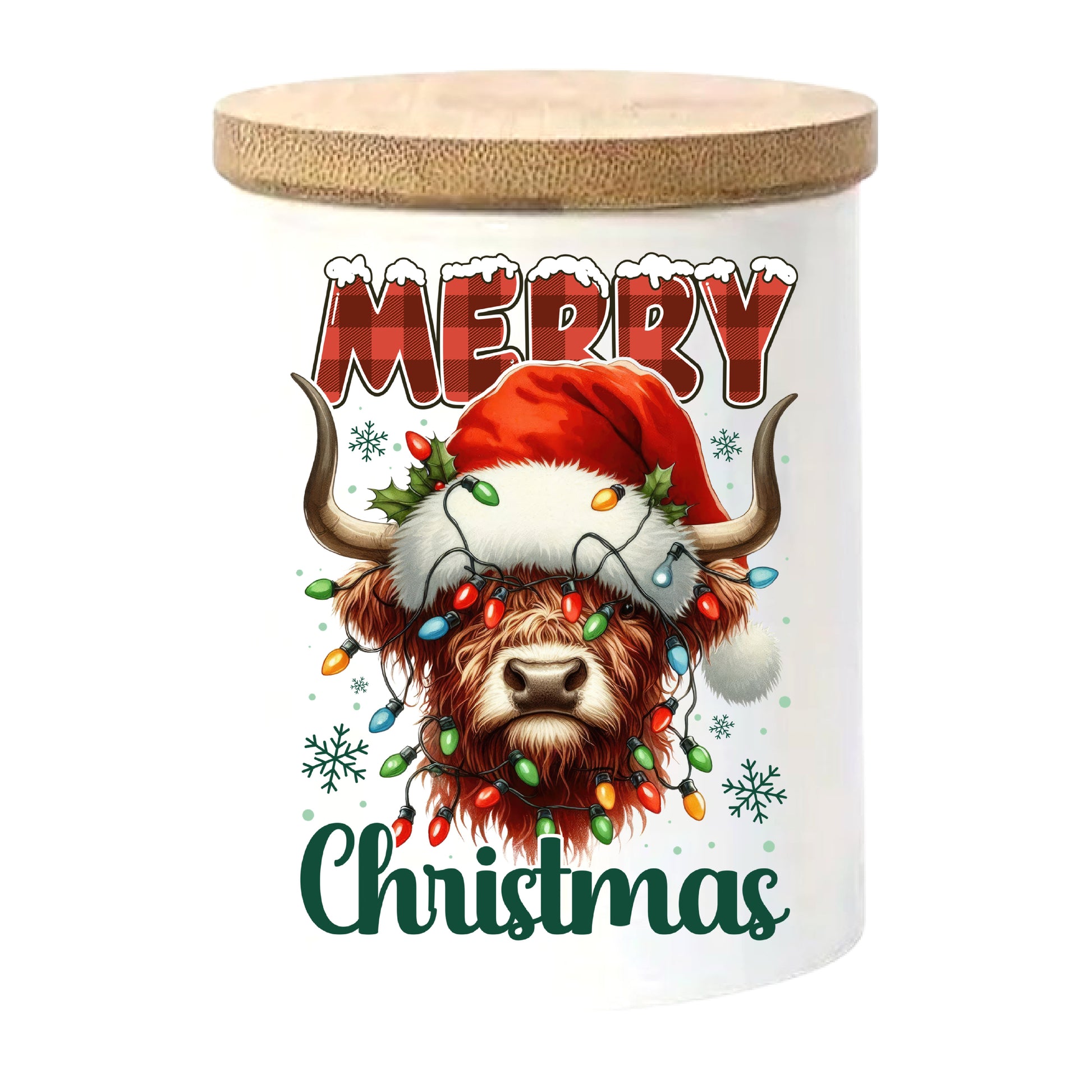 Merry Christmas Highland Cow| Christmas Holiday Soy Candle in Reusable Ceramic | North Bark Scent + Crackling Wood Wick