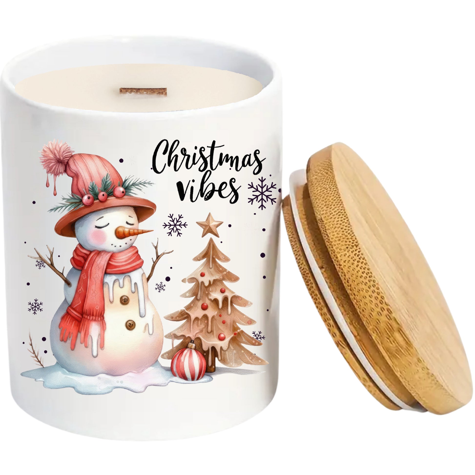 Merry Christmas Vibes | Christmas Holiday Soy Candle in Reusable Ceramic | Mahogany Teakwood Scent + Crackling Wood Wick